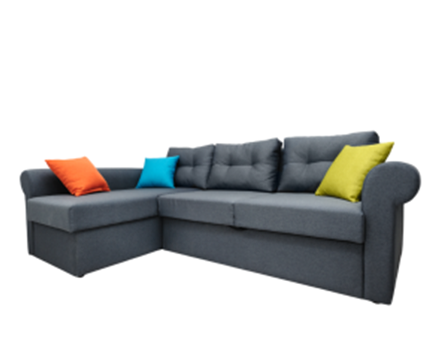 Grey Contemporary modular design with soft grey upholstery and a left-side chaise. Includes vibrant accent pillows in orange, blue, and lime for a pop of color. Ideal for flexible seating in modern living spaces.