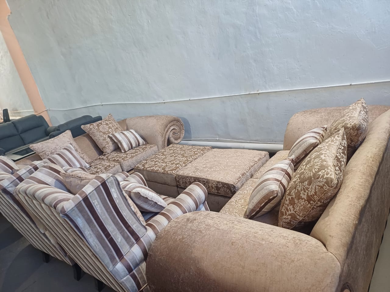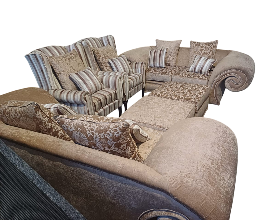 Beige & Striped Featuring a grand sectional with floral motifs, matching striped armchairs, and a coordinated ottoman, this ensemble brings elegance and comfort into any home. Perfect for spacious interiors that call for timeless charm and cozy sophistication.