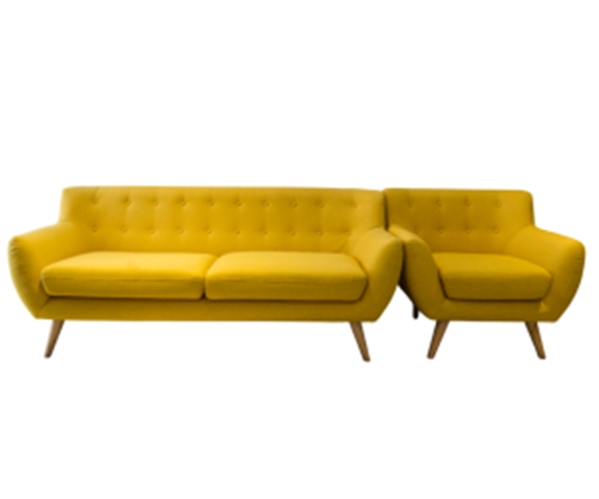 Sofa & Armchair Set A radiant pairing featuring bold yellow upholstery, wooden legs, and button-tufted cushions. This modern lounge set adds warmth and personality to any space—perfect for relaxed entertaining or everyday comfort.